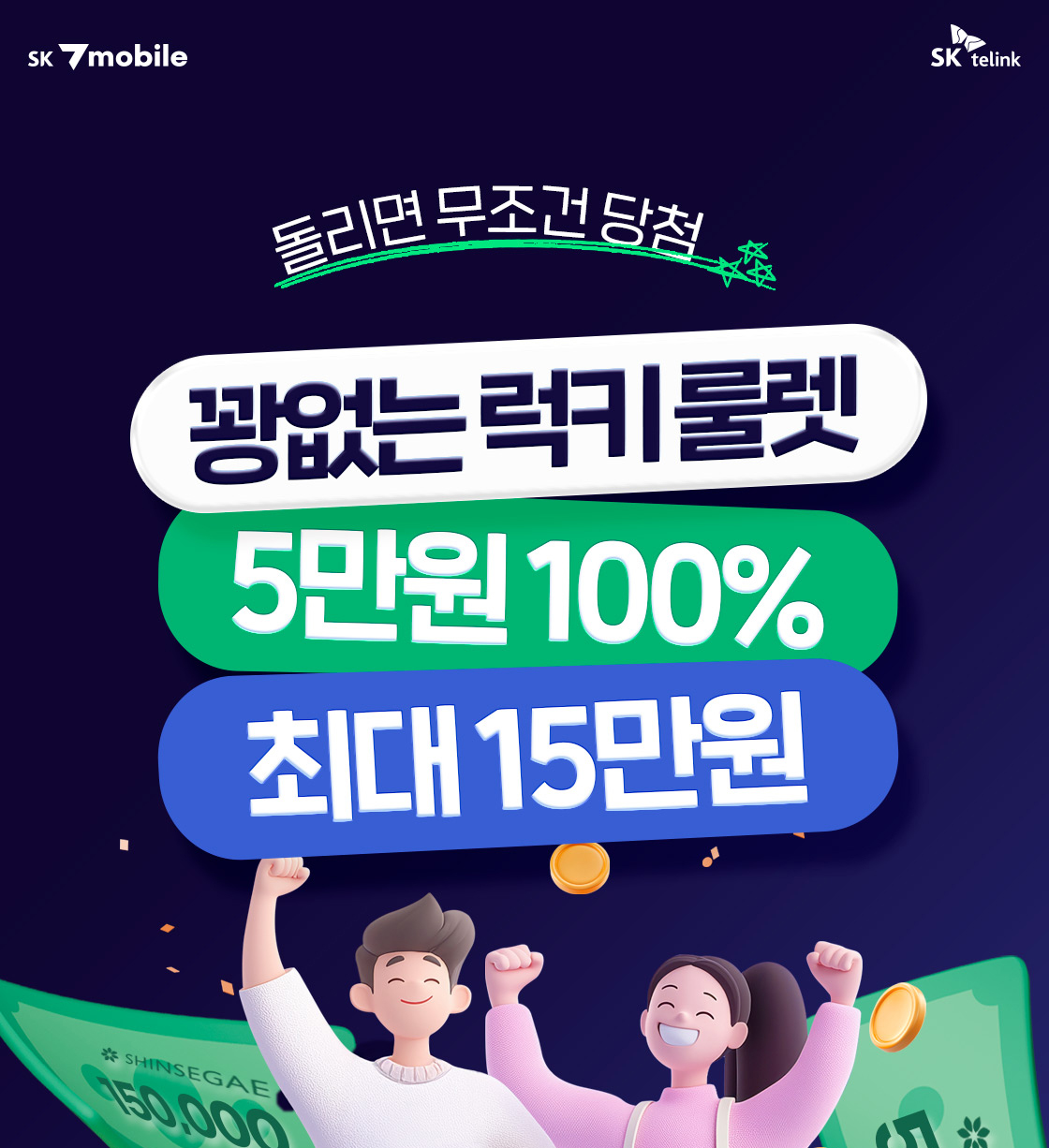 - 혜택은 이벤트 기간 내 개통 이력이 확인된 번호 기준으로 제공됩니다. 사은품 당첨 금액 확인 및 정확한 지급을 위해 이벤트 참여 시 입력한 번호와 SK 세븐모바일 개통 번호가 일치해야 혜택 지급이 가능하오니, 동일한 번호로 참여해 주세요. 이벤트 기간 중 SK 세븐모바일을 먼저 개통하셨더라도, 기간 내에 룰렛을 돌리면 혜택이 지급됩니다.