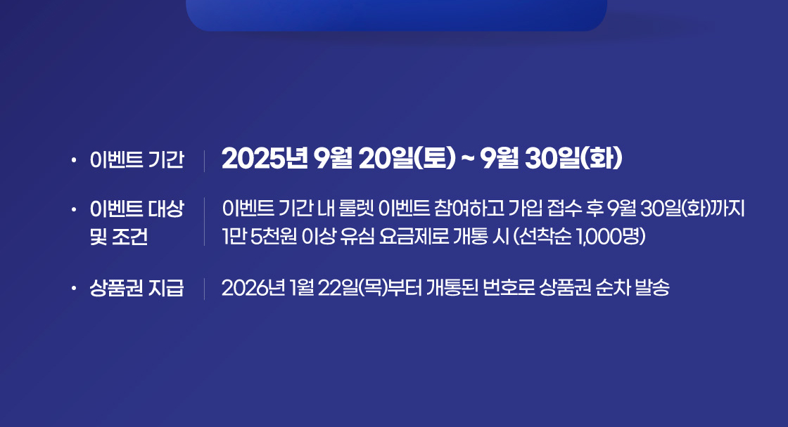 - 이벤트 기간 및 대상: 9/20(토)~30(화)에 룰렛 이벤트 참여하고 가입 접수 후 9월 30일(화)까지 이벤트 대상 요금제로 개통한 고객 (선착순 1000명)