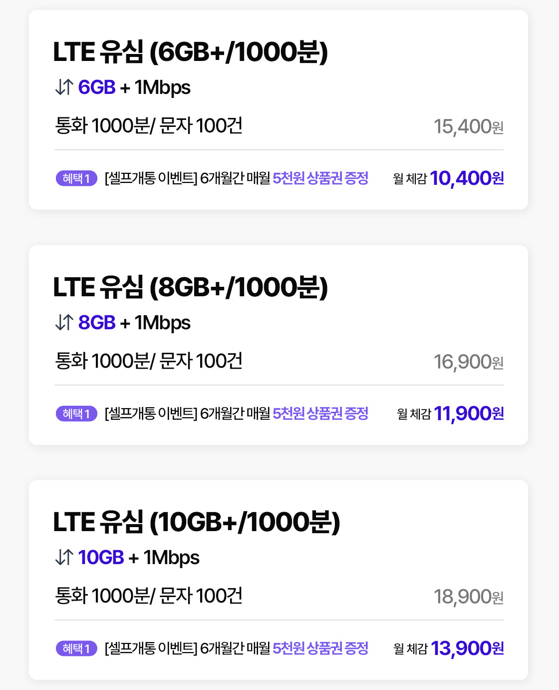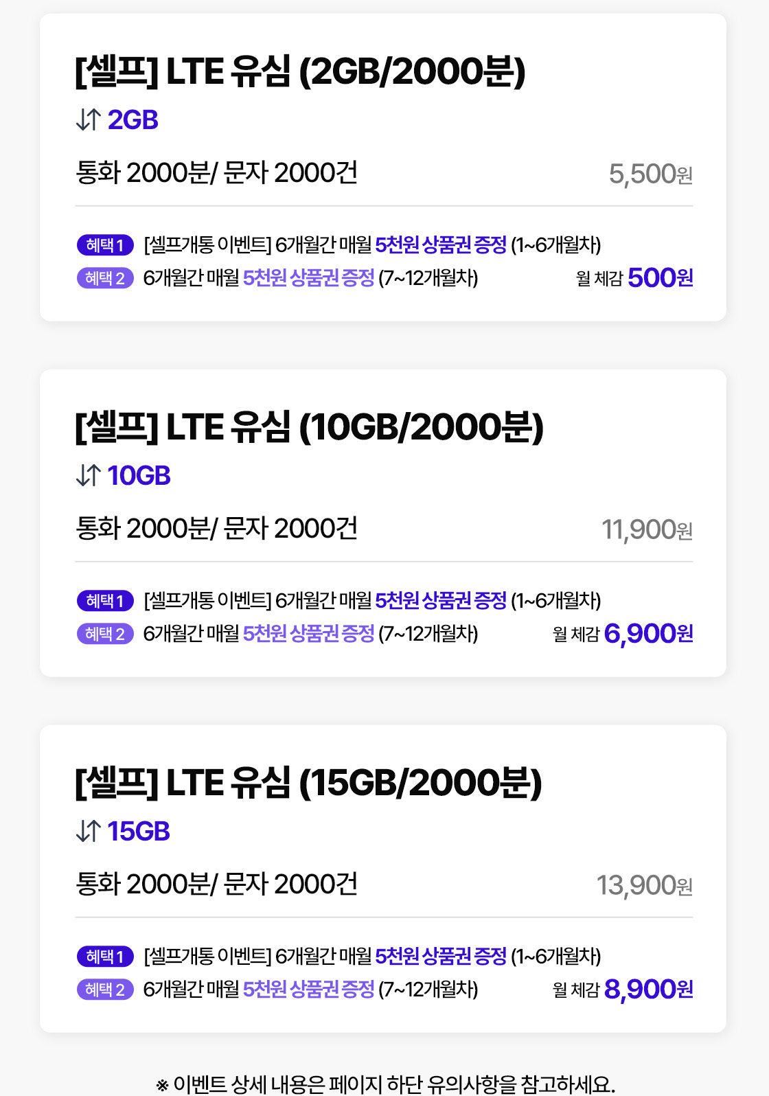 • 해당 이벤트는 2000분 요금제 가입 이벤트, 무제한 요금제 가입 이벤트, 데이터 안심 요금제 가입 이벤트의 상품권 혜택과 중복 지급되지 않습니다.