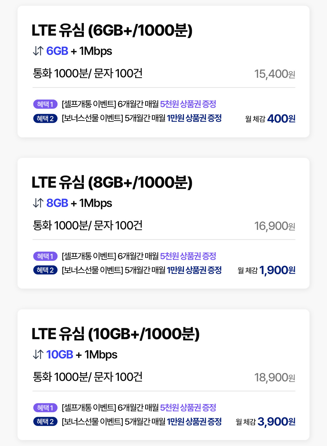 • 해당 이벤트는 2000분 요금제 가입 이벤트, 무제한 요금제 가입 이벤트의 상품권 혜택과 중복 지급되지 않습니다.