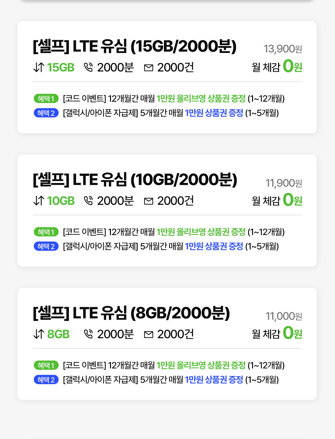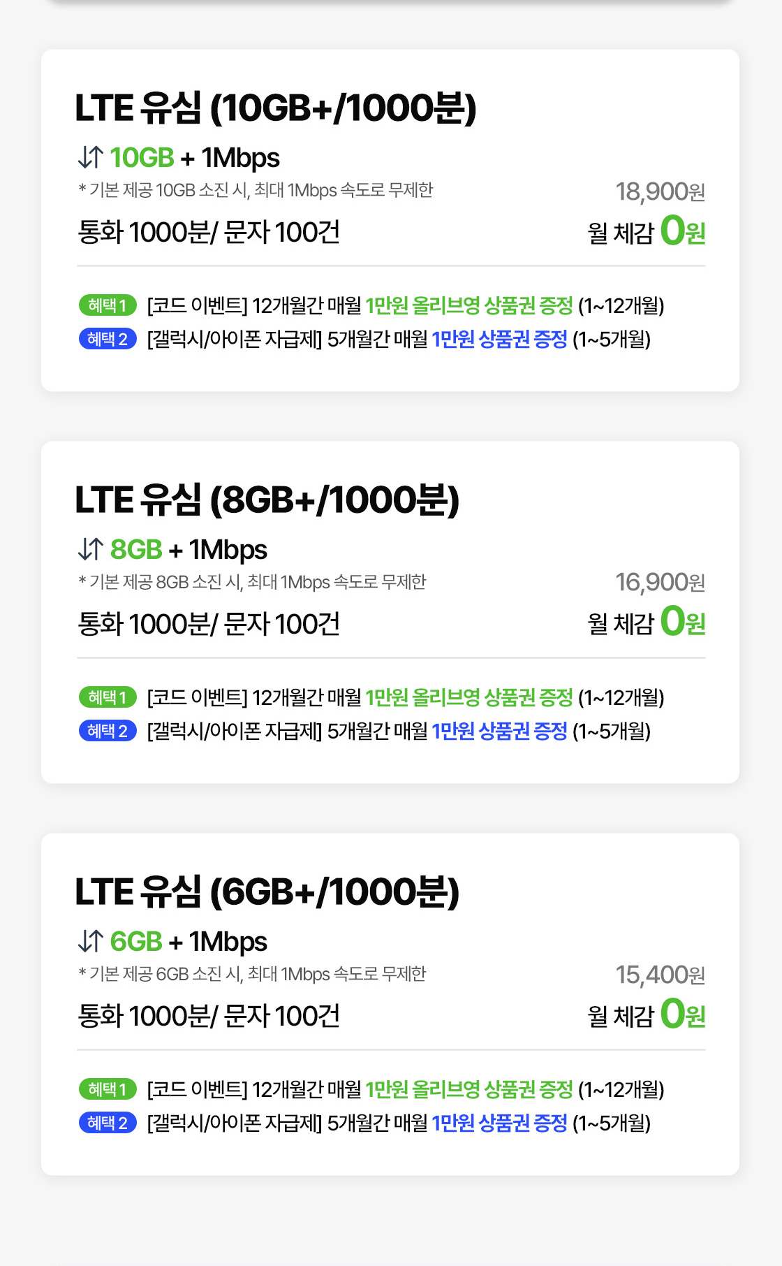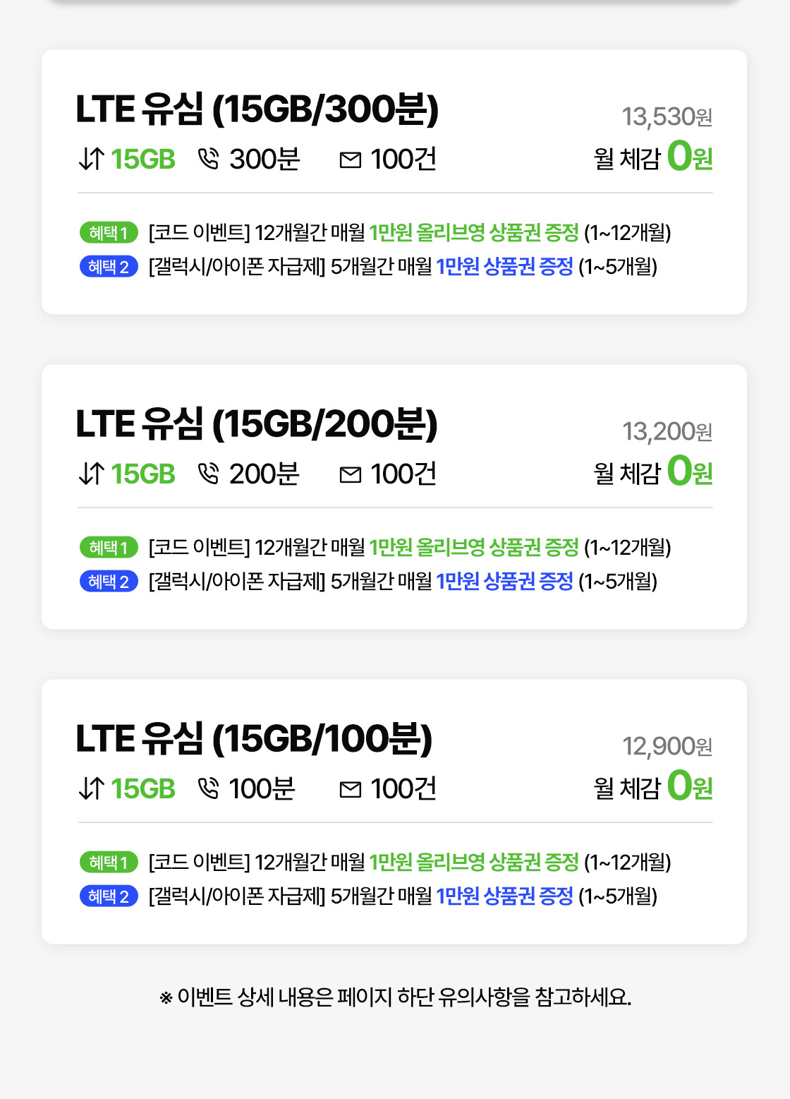 • 해당 이벤트는 음성 2천분 요금제 가입 이벤트, 무제한 요금제 가입 이벤트, 5G 실속 1000분/안심 요금제 가입 이벤트, 데이터 안심 요금제 가입이벤트의 상품권 혜택과 중복 지급되지 않습니다.