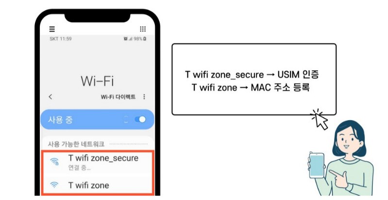 T wifi zone은 MAC 인증으로 접속하고, T wifi zone_secure는 유심(USIM) 인증으로 접속해 보안성을 강화한 wifi이죠. 차례로 이용 방법을 설명해 드릴께요!
