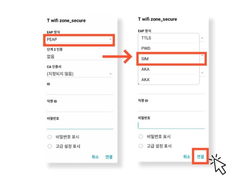 T wifi zone secure의 경우, USIM 인증 가능한 기기에 한하여 접속이 가능합니다. WiFi 연결 시 EAP 인증방식을 SIM으로 변경하여 설정해주면 연결됩니다.