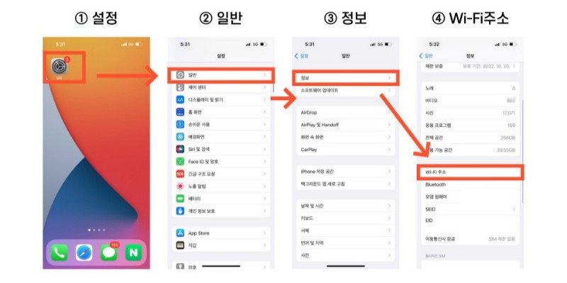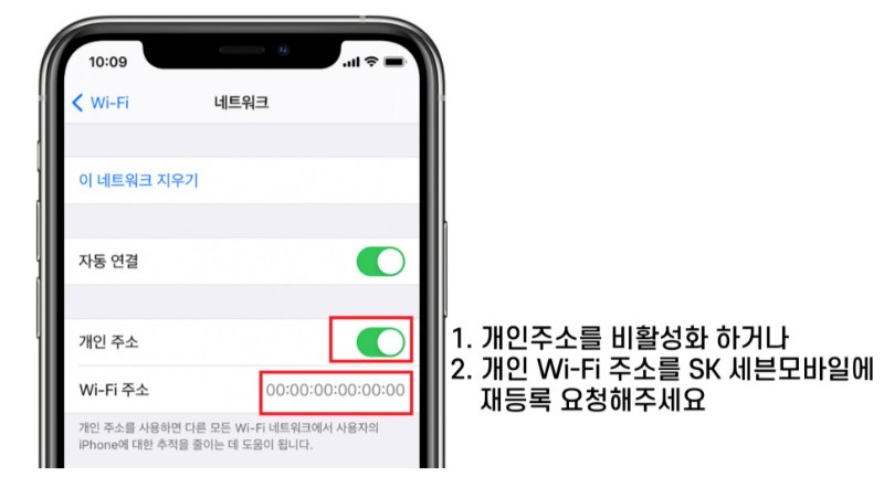 SK 세븐모바일에 등록되어있는 MAC 주소를, 아래의 비공개 WiFi 주소로 변경해주시면 됩니다!